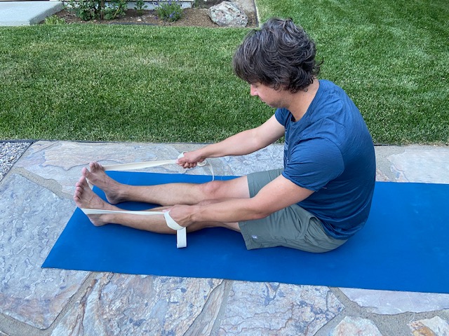 You can use a yoga strap, dog leash, belt, scarf or anything long and not too flexible. If you’re looking for a great stretching strap, we recommend this one: